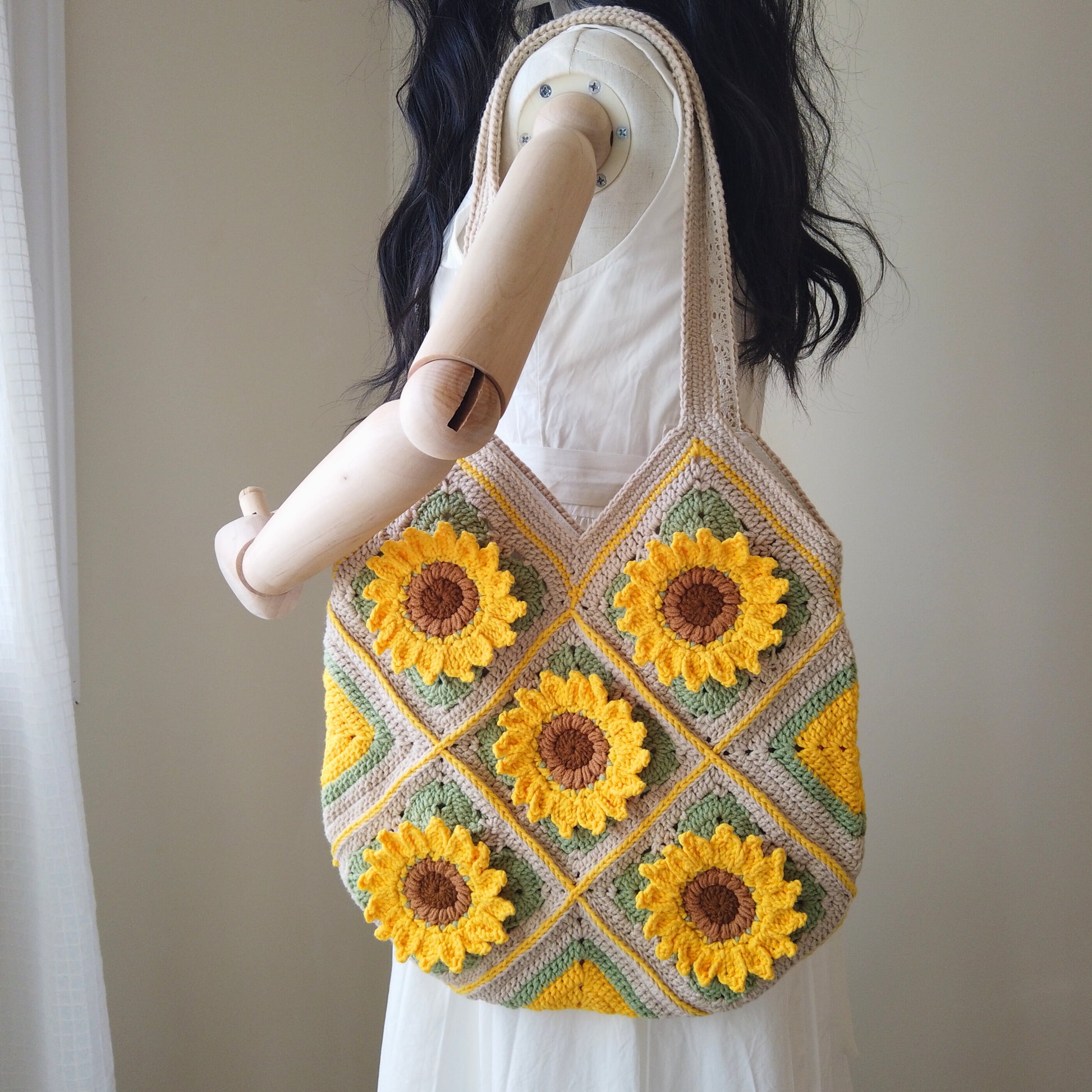 Brighten your day with this handmade sunflower crochet tote bag, decorated with 10 large 3D sunflower patches that bring a cheerful touch to any outfit.