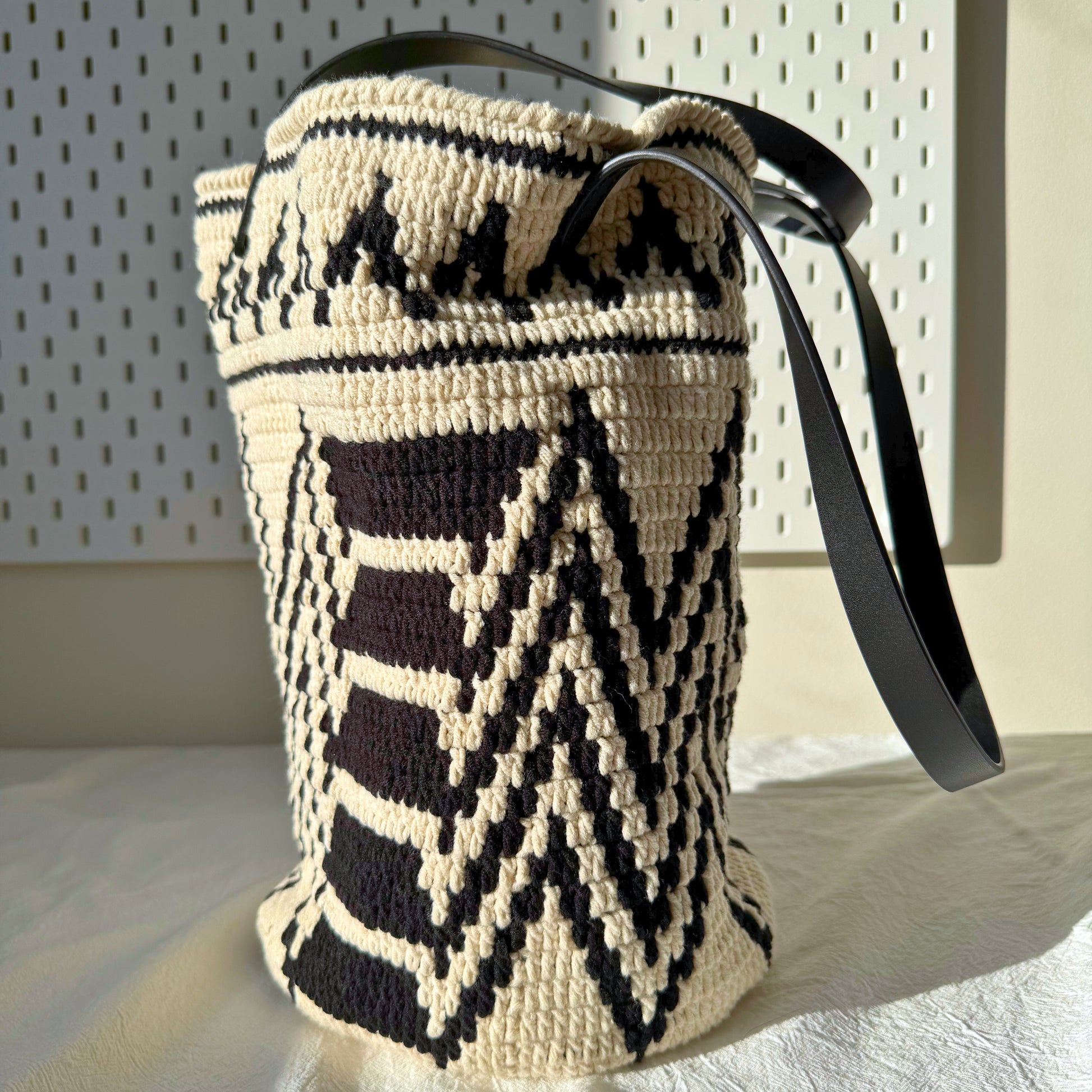 Meet Midnight Echo, a bold and sculptural crochet tote that speaks in clean lines and quiet confidence. Her black-and-ivory palette makes every zigzag feel timeless, modern, and effortlessly cool.